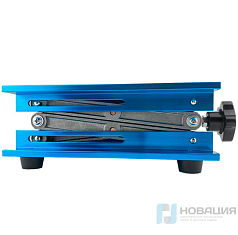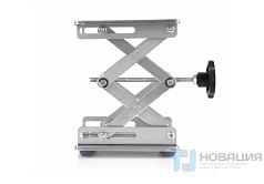 Подъемный столик позволяет менять уровень, на котором расположены приборы или их части. Расстояние корректируется за счет Х-образных опор под столешницей. Они складываются и раздвигаются вращением винта. Механизм упрощает монтажные и лабораторные работы.