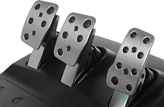 Функция виброотдачи с регулируемым уровнем усилия добавляет ощущение дорожного рельефа, заносов и виражей на виртуальной трассе. В комплект входят педали газа и тормоза. Совместим с ПК.