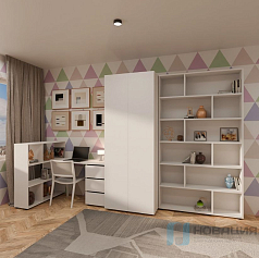 Встроенный стеллаж добавляет дополнительную полезную площадь, предполагая аккуратное размещение книг, документов и аксессуаров. Элегантный дизайн подчеркивает современность интерьера, превращая рабочее место в функциональный и стильный элемент обстановки.