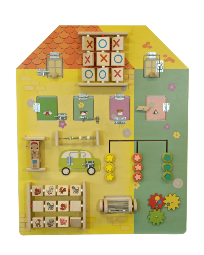 1-сторонний бизиборд покрыт безопасной несмываемой краской, не имеет запаха. Поверхность можно дезинфицировать. Настенная панель оснащается вращающимися элементами, лабиринтами, шестеренками, замочками, игрой в крестики-нолики. Занятия с подвижными деталями дают первые представления о физических процессах, развивают сообразительность, моторику пальцев рук, фантазию.