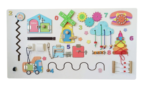При помощи деталей бизиборда дети выполнят 26 упражнений, которые улучшат память, внимание, мелкую моторику, цветоразличение и логическое мышление.