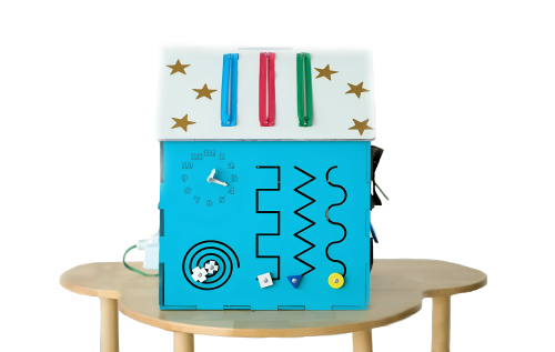 Бизиборд в виде дома состоит из шести панелей, на каждой из которых есть тактильные элементы: шестеренки, дверцы с замками, циферблат, пуговицы, молнии, резные дорожки и пр. Игры с бизидомом способствуют сенсорному развитию, укрепляют память, тренируют мелкую моторику.