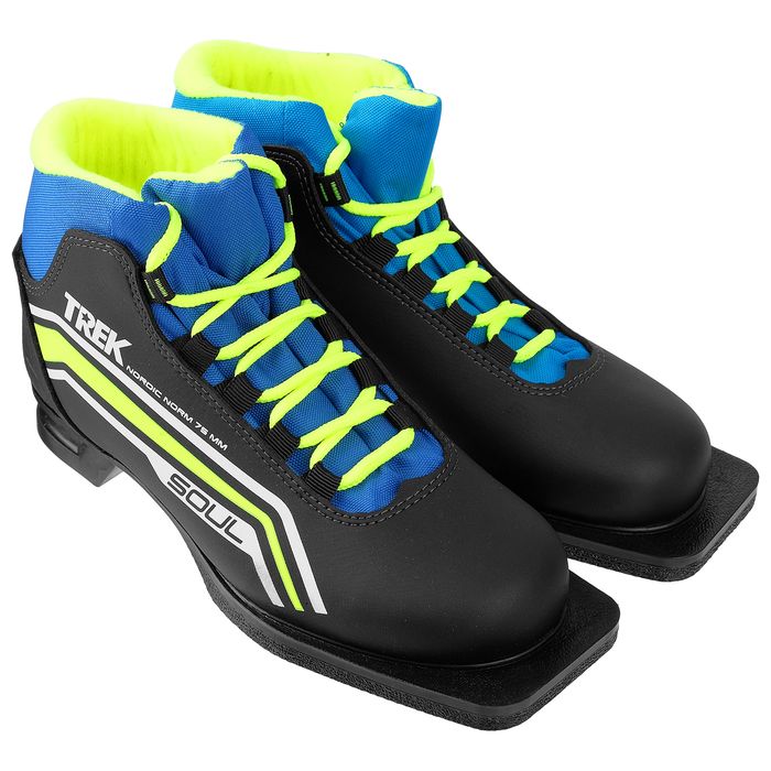 Черные ботинки для классического хода украшены цветными элементами и логотипом, подходят для лыжных креплений NN75. Обувь на клеевой подошве, с мягким кантом и языком, оснащается влаго- и ветрозащитной пропиткой. Трехслойный внутренний материал сохраняет тепло.