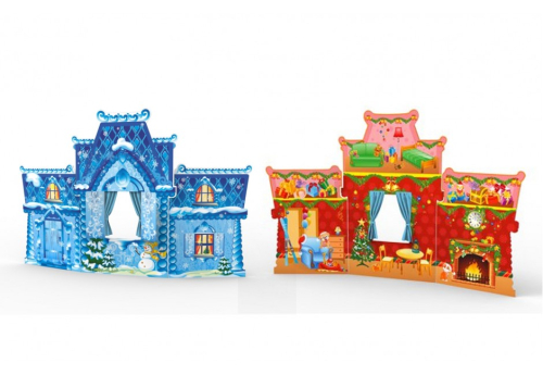 На двухсторонней декорации нарисовано жилище Деда Мороза. Установка подходит для праздничного оформления коридоров, сцены. Показан вид снаружи и изнутри. Ставни открываются.