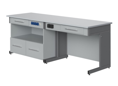 Материал столешницы ламинат, химически стойкий пластик, выдерживающий кратковременный контакт с кислотами, щелочами, растворителями. Пластик термически стоек, и не разрушается от кратковременного контакта с высокотемпературными образцами до 180 С. Торцы столешницы оклеены ударопрочной, хим. стойкой пластиковой кромкой.