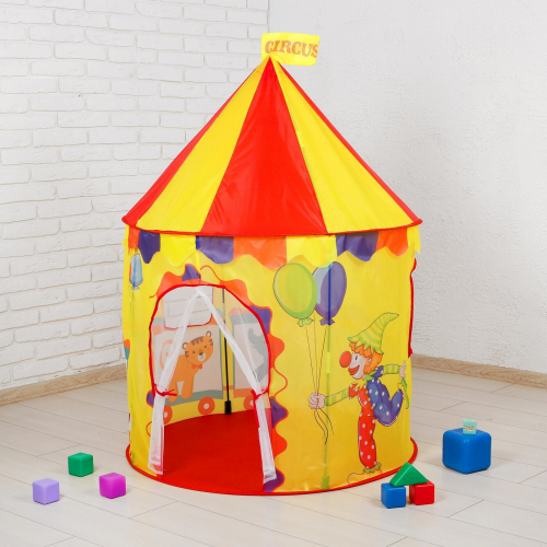 Палатка для детского уголка выполнена в виде циркового шатра. Легкий складной чехол расправляется, превращаясь в сооружение с круглым полом. Есть окна и арочный проем, прикрытый половинками дверцы из прозрачного текстиля. Их можно закрепить веревками по бокам от входа.