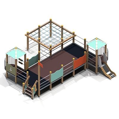Комплекс для отдыха сборно-разборный. Сетка устанавливается горизонтально. На столбе закрепляется фанерный флаг. Поверхности площадок и ступеней не скользят.