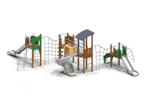 Конструкция с горками (открытыми нержавеющими, спиралевидной), займет площадь размером 15740х13250 мм. Для лазанья есть канатные сетки, металлическая лиана, подвесной мостик, трап-барабан с канатом, шест с крутящимися элементами. Одна площадка оборудована крышей. Ограждения в виде труб, заборчиков, фигурных секций не дадут ребенку упасть.