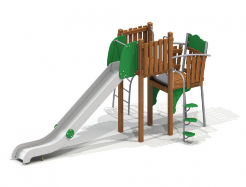 Конструкция с горкой и элементами для лазанья укреплена угловыми элементами. Опирается на столбы из дерева и металла. Площадки окружены заборчиками. Нержавеющий скат дополнен защитной секцией и бортами.