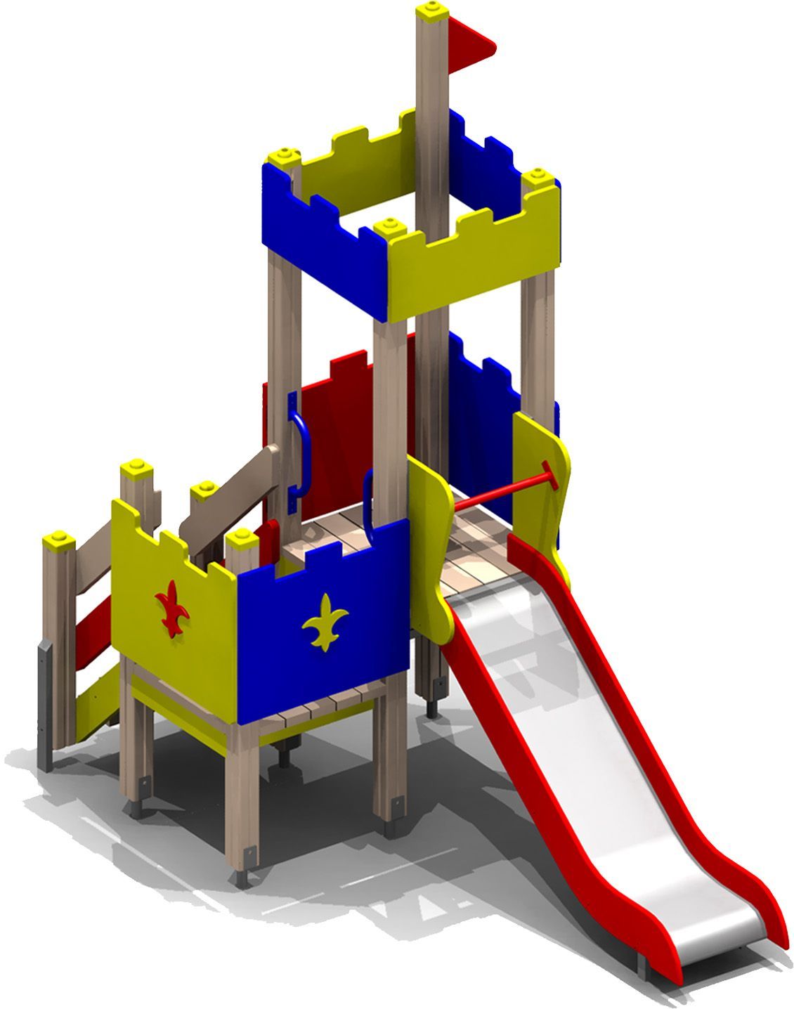 Фигурные ограждения, имитация крыши, защитная секция горки, бортики ската и ступени лестницы изготавливаются из влагостойкой фанеры. Поручни, скат, перекладина над горкой и подпятники столбов металлические. Перила лестницы и полы в башнях выполняются из влагостойких деревянных досок.