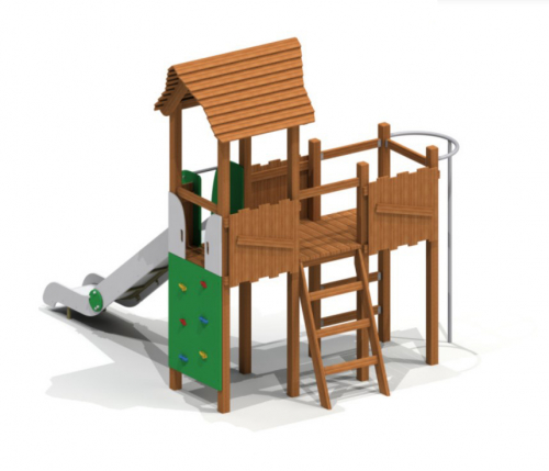 К башне под 2-хскатной фигурной крышей пристроена площадка с ограждениями, горка, лестницы с перекладинами, альпинистская стенка с зацепами, вертикальный шест на дугообразном креплении. Конструкция опирается на несущие столбы. Деревянные элементы сохранят прочность после осадков. Скат горки с бортами и защитной секцией не ржавеет.