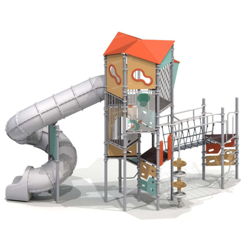 В игровом комплексе соединились разные виды поверхностей для лазанья, разные типы ограждений (в том числе: с фигурными окошками, с отверстиями-арками, полностью прозрачные, решетчатые). Материалы рассчитаны на любую погоду.