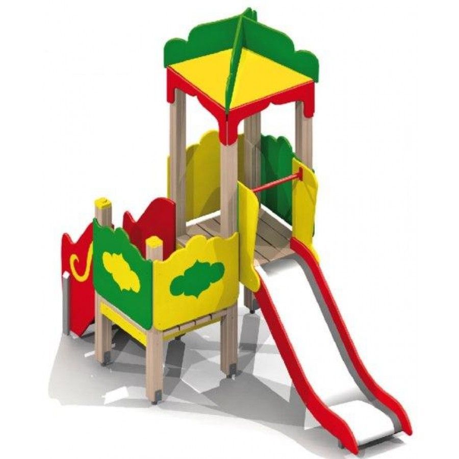В составе комплекса: крытая башня, горка, лестница, крыша, ограждения, перекладина.