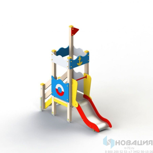 Оборудование сборно-разборное. Украшено изображением якоря, спасательного круга. На столбе декоративный флаг. Верхние стороны крыши и ограждения волнообразные. Нержавеющий скат дополнен защитной секцией с перекладиной, d 33 мм, окружен бортиками, h 100 мм.