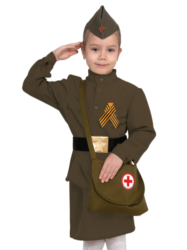 Костюм военной медсестры для девочек состоит из гимнастерки, ремня, юбки, пилотки, сумки, стетоскопа и георгиевского банта. Подходит для постановки сценок и спектаклей, посвященных 9 мая и 23 февраля.