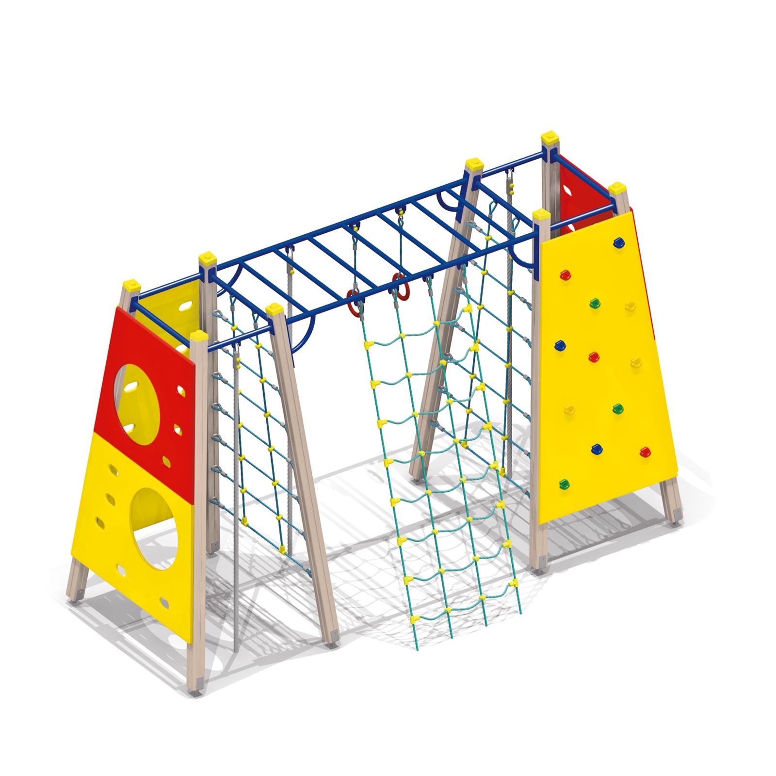 Несущие столбы устанавливаются под наклоном. Альпинистские стенки с прорезями для рук и ног или зацепами выполняются из фанеры. Канатные сетки держатся на пластиковых креплениях. Гимнастические кольца изготавливаются из пластика или влагостойкой фанеры и закрепляются на гибких подвесах. К перекладинам подвешиваются полиамидные или полипропиленовые канаты для лазания. Рукоход металлический.