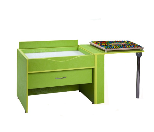 Стол-парта оснащается подсветкой и дополнительными отсеками. Такая мебель позволяет рисовать песком, заниматься лепкой, собирать мозаику. Материалы поставляются вместе с оборудованием и хранятся внутри. RGB-подсветка управляется при помощи пульта.