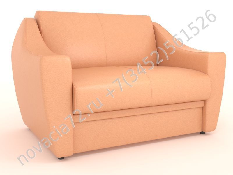 Двухместный диван оснащен спинкой и подлокотниками. Все углы конструкции скруглены. Материал обивки подходит для влажной уборки.