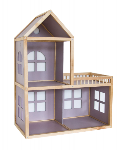 Трехэтажный домик подойдет для игр с куклами высотой до 30 см. Выполнен в сиреневых тонах. Состоит из трех комнат, террасы и чердака. Детали крепятся друг к другу на евровинты, которые входят в комплект. Передние стенки можно двигать во время игры.