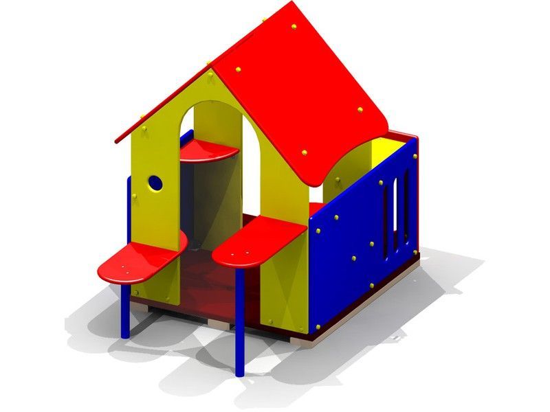 Конструкция включает в себя: домик с 2-скатной крышей, стенки с 2-мя входами, балконные перила, боковые панели с 2-мя сиденьями и 2-мя столиками.