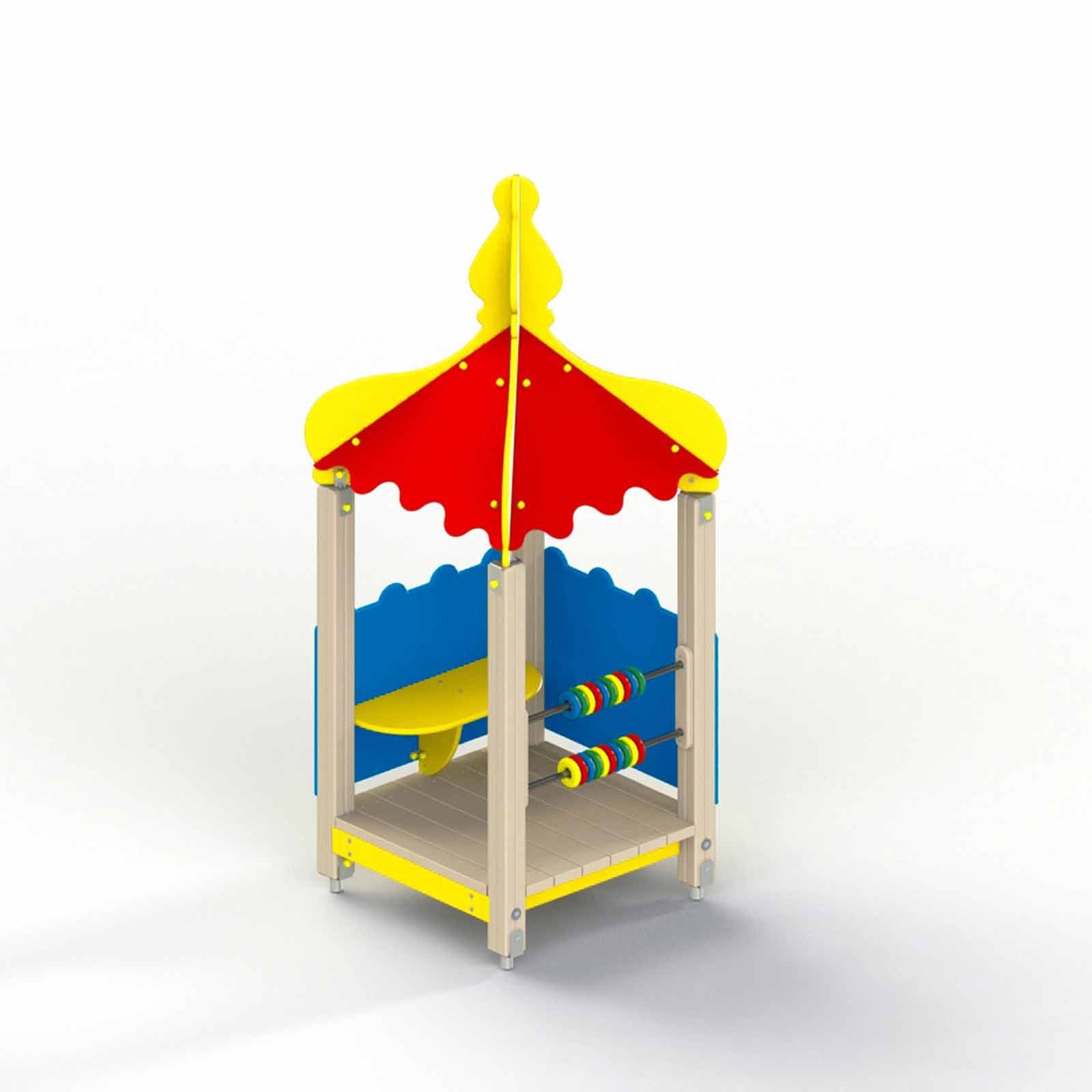 В домике со скамейкой 4 столба, 2 стены из фанерных ограждений, пластиковые или деревянные счеты на перекладине, d 33 мм. На одной стороне предусмотрен вход. Пол составлен из деревянных досок. Низ 4-хскатной крыши и верхний край ограждений волнообразный.