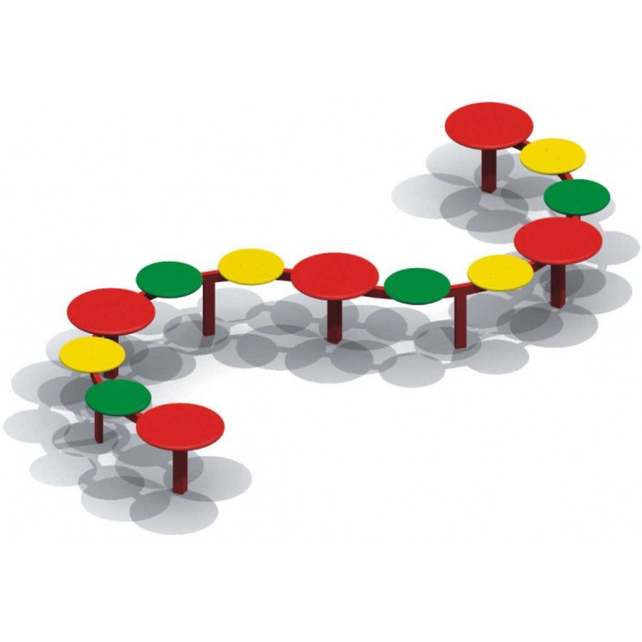На 5-ти опорных стойках из профильной трубы закрепляется каркас с круглыми фанерными столешницами. Ребенок осуществляет шаги и учится держать равновесие.