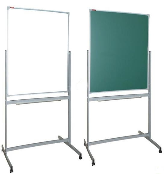 Покрытие классной доски исключает блики. Лист из стали окружается алюминиевым профилем и устанавливается на стойку. На белую поверхность можно проецировать изображения. Обе поверхности притягивают магниты.