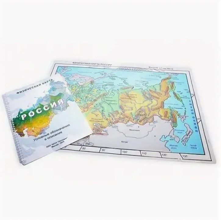 Физическая карта РФ (1 плоскопечатный лист, 1 лист со шрифтом Брайля) сопровождается альбомом условных обозначений (5 плоскопечатных листов, 1 лист со шрифтом Брайля).