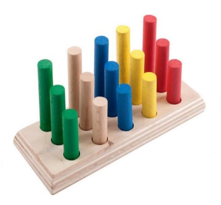Набор для логопедических игр представлен дощечкой с 4-мя рядами одинаковых по размеру отверстий, в которые вставляются разные по цвету и размеру деревянные цилиндры. Задача ребенка — расположить детали в правильной последовательности.