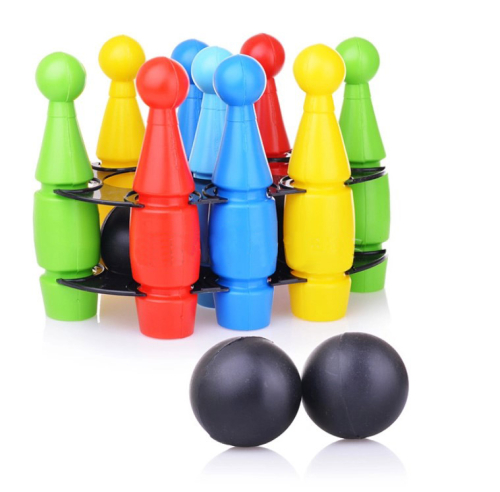 Спортивный инвентарь для тренировки глазомера и координации движений представлен игровым набором. Участники по очереди выбивают кегли, бросая шар с заданного расстояния. Возможны индивидуальные занятия.
