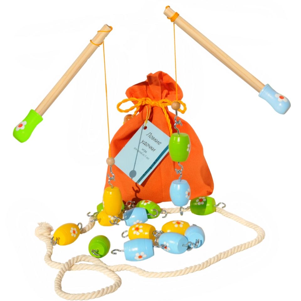 В комплекте: 2 удочки, 15 фигурок, веревка-ограничитель, правила, мешочек из льняной ткани.