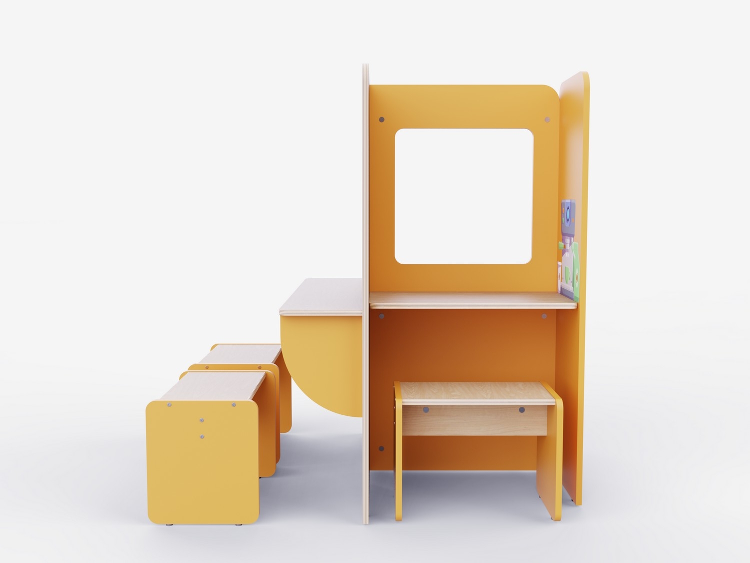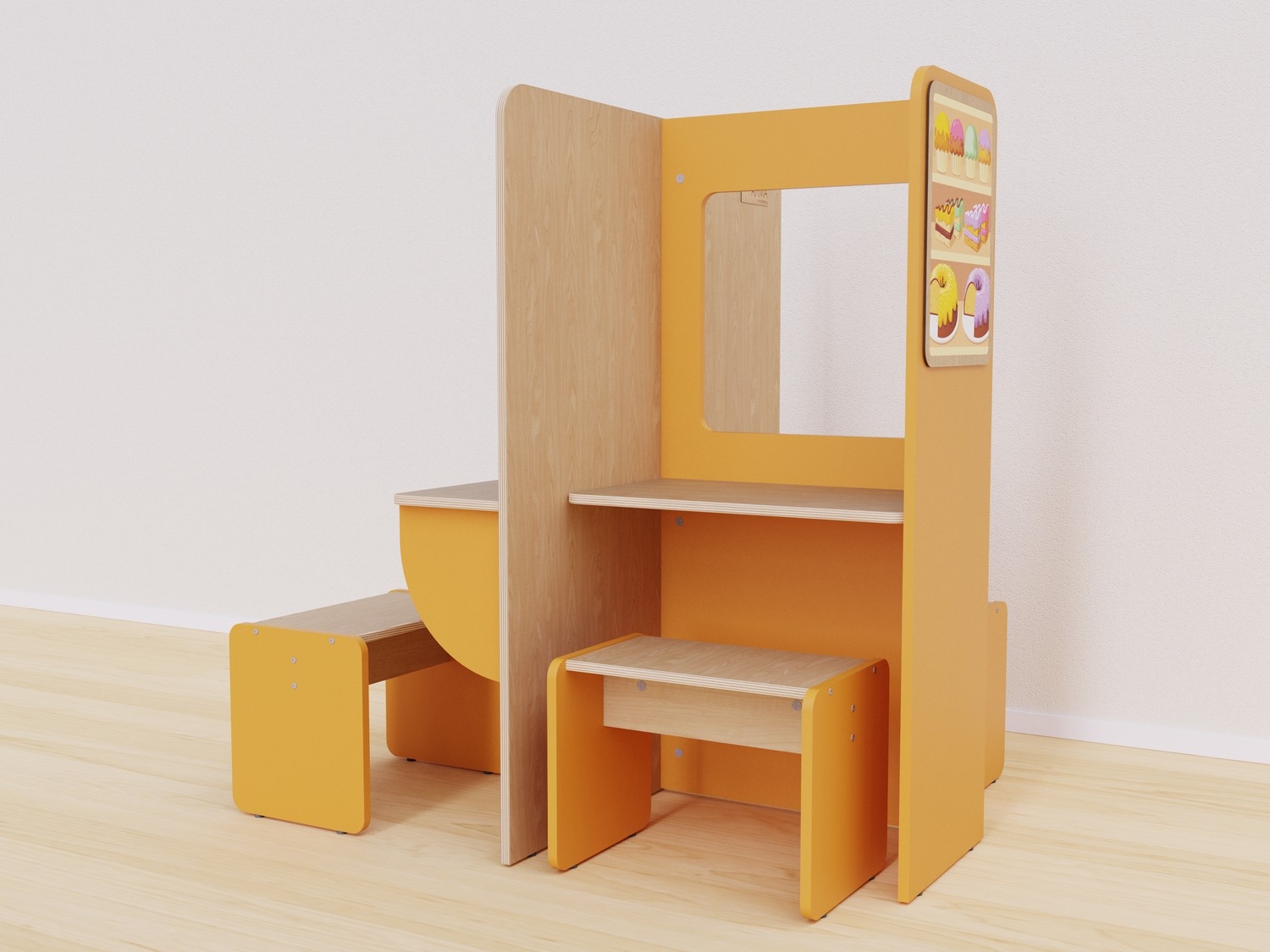Игровая зона «Кофейня» предназначена для сюжетно-ролевых игр в детских садах и дошкольных учреждениях, позволяя детям примерить роли бариста, кассира и посетителя.