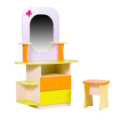 Зона для игры представлена 2-мя выдвижными ящиками, овальной столешницей, 5-ю открытыми полками и нишами, настоящим зеркалом с обработанной кромкой, а также отдельно стоящим предметом мебели — стульчиком (все края конструкции скруглены).