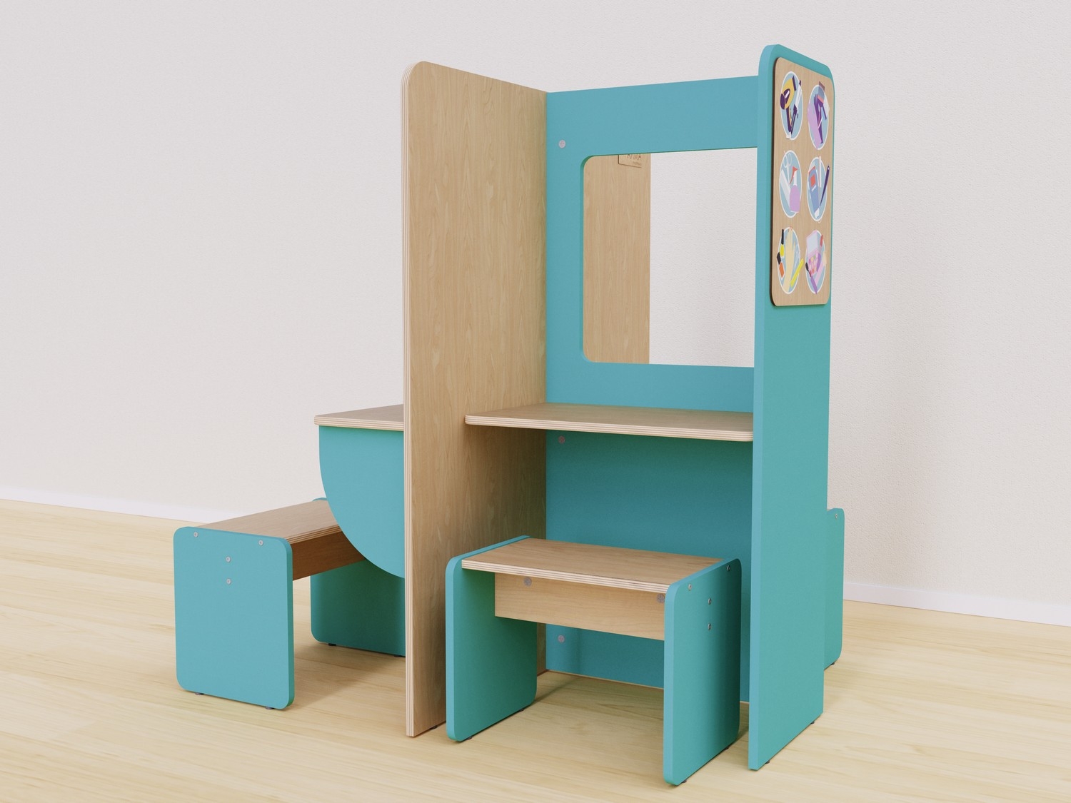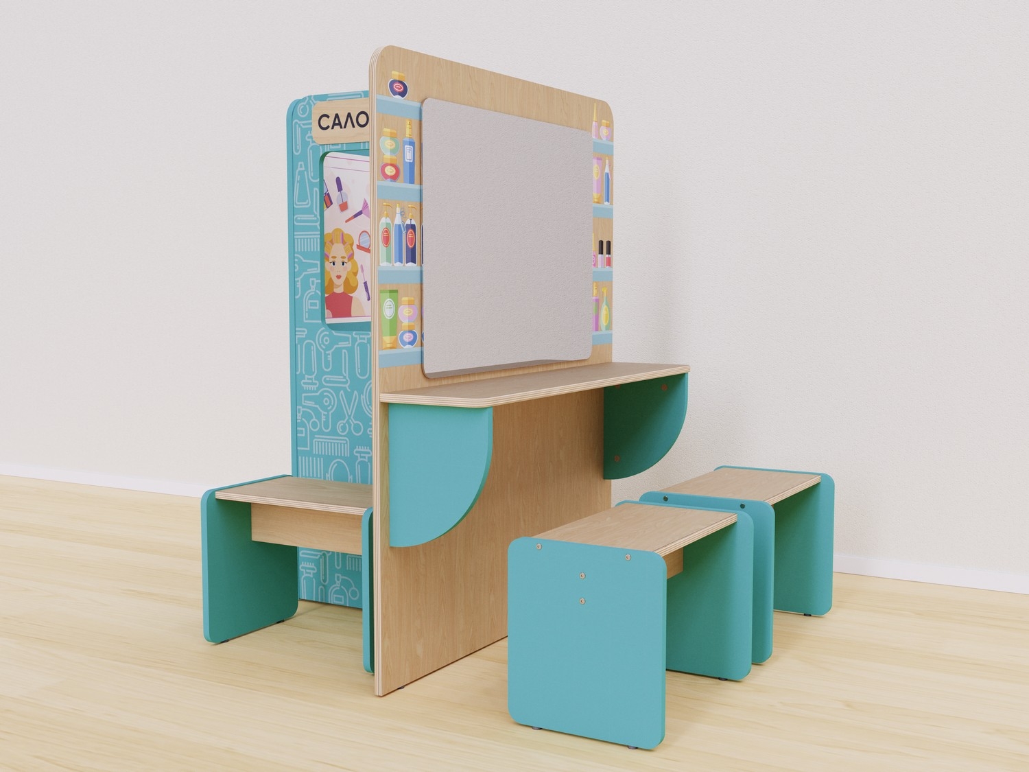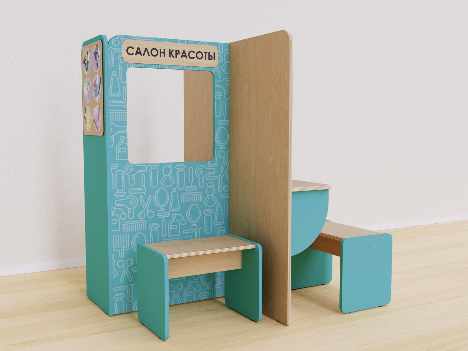 Конструкция разработана так, чтобы дети могли использовать все ее стороны. Каждая сторона отражает разные аспекты работы в салоне красоты: