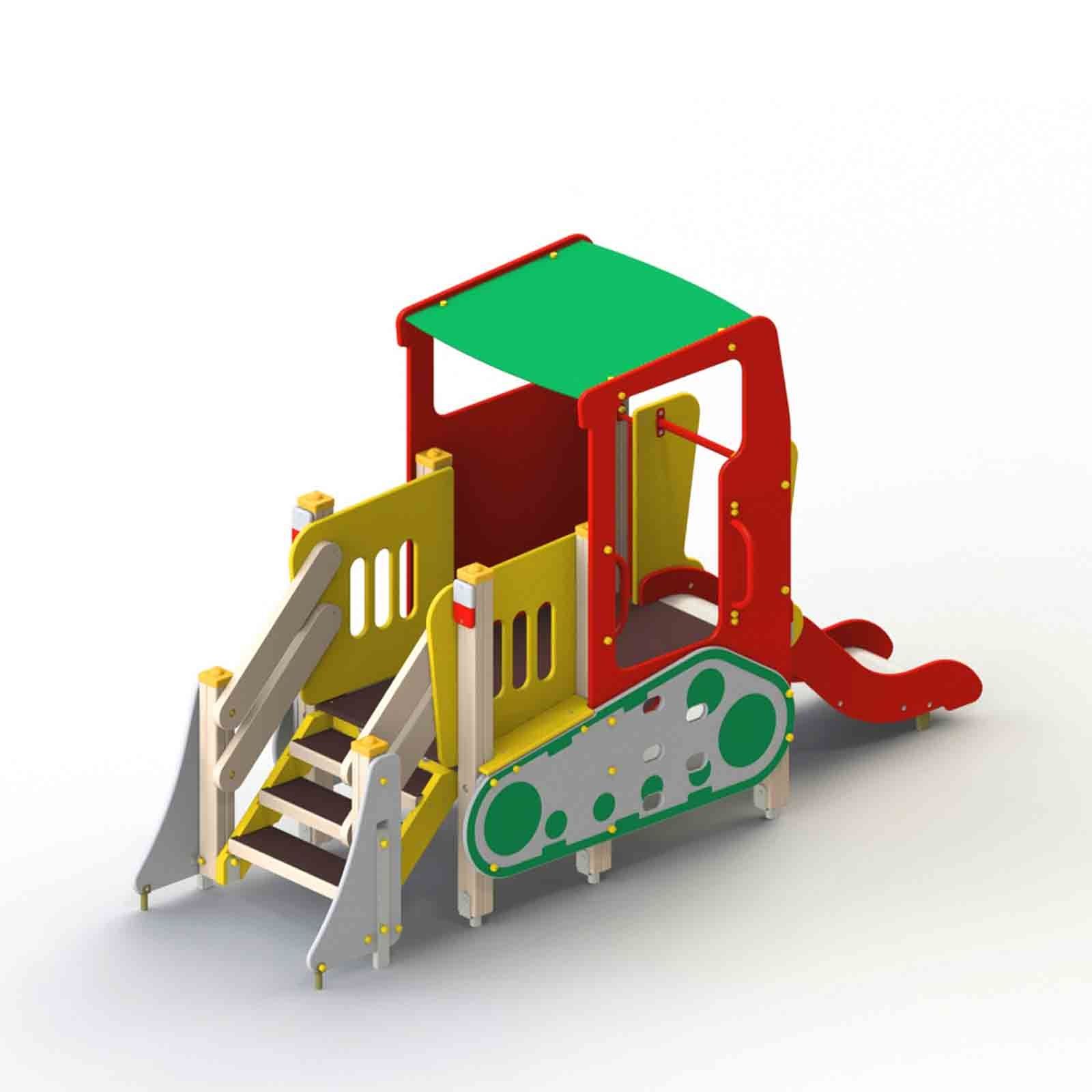 Комплекс оформлен в виде бульдозера. На боковых стенках есть вход и окошко. Под ними накладные детали с имитацией гусениц. Нескользящую лестницу дополняют укрепленные перила.
