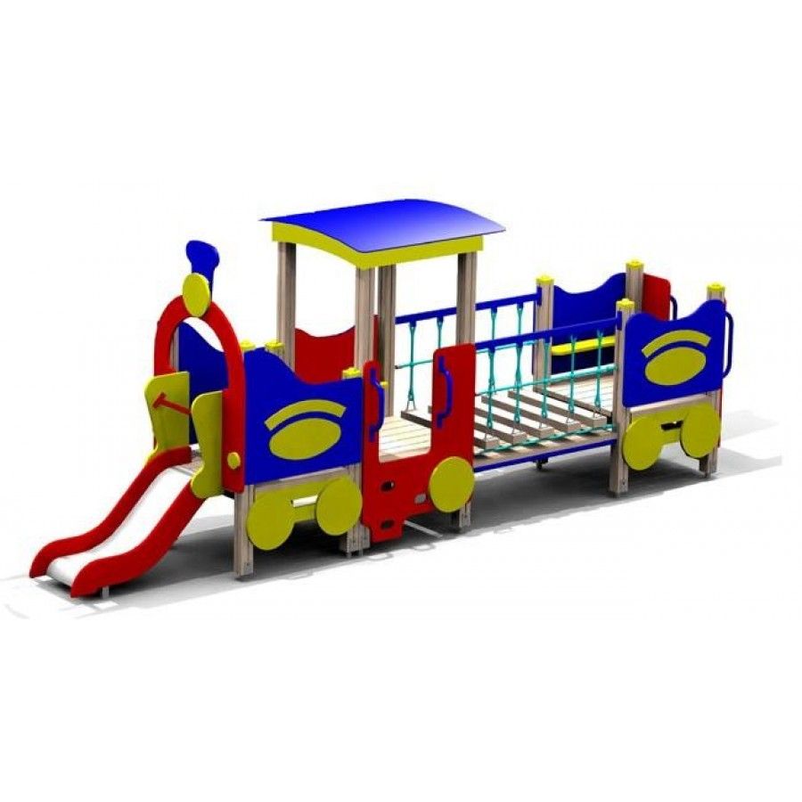 Комплекс в виде паровоза с вагончиком оснащен 2-мя входами на заднем и боковом бортах. В панелях проделаны отверстия, чтобы поставить ногу при подъеме. Ограждения украшены фигурными накладными элементами. Для сходства с транспортом декор дополнен имитацией колес, выпускной трубы, прожектора. Над стартовым участком горки арочный элемент.