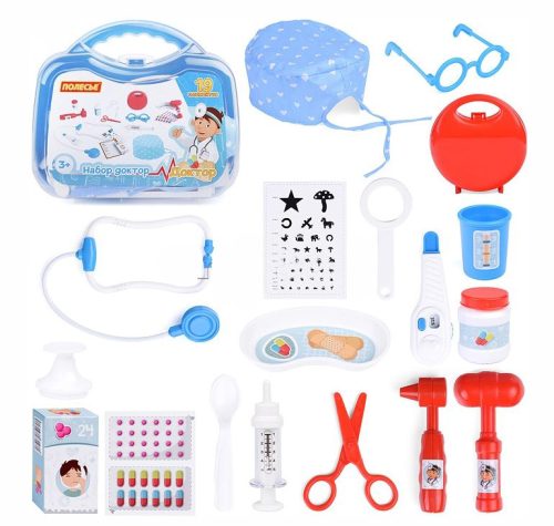 Набор для сюжетно-ролевой игры знакомит дошкольников с атрибутами врачебной профессии. Занятия с безопасными предметами позволяют избавиться от страха перед посещением поликлиники, узнать новое о деятельности доктора, запомнить названия и назначения приборов.