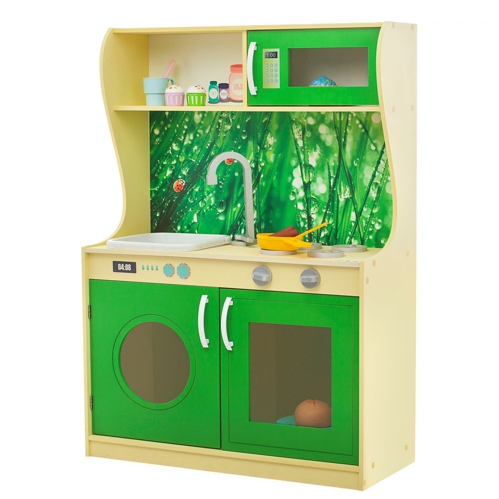 На рабочей поверхности находятся раковина и варочная панель с 4 конфорками. В нижней части гарнитура расположены стиральная машина и духовой шкаф. Над рабочей поверхностью размещены микроволновая печь и полка для хранения игровых аксессуаров. В боковой части установлен двухкамерный холодильник. Игры с кухней окажут положительное влияние на развитие воображения и творческого мышления .