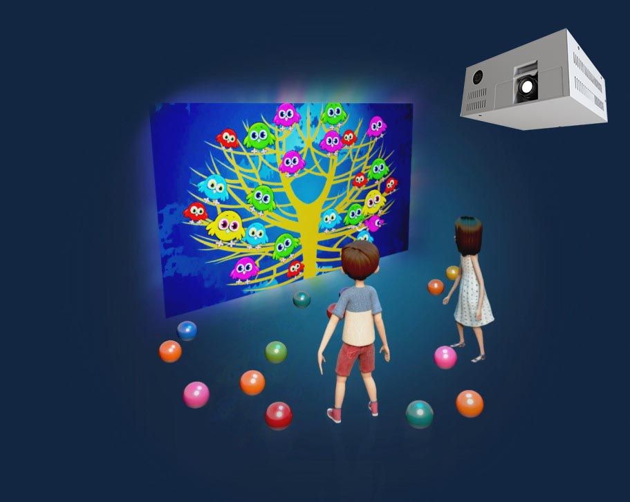 Проектор с компьютером встроены в защитный корпус, который закрепляется под потолком на высоте 2-6 м. Управление картинкой – местное беспроводное или через Wi-Fi. Благодаря цветной проекции стена превращается в игровое поле с мишенями. Датчики считывают движения ребенка, реагируют на касание предметом, броски.