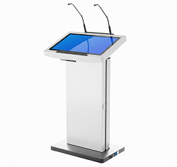 Трибуна оснащена мощным микрофоном, сенсорным дисплеем для спикера, а также дополнительным большим внешним дисплеем и набором разъемов для подключения техники.