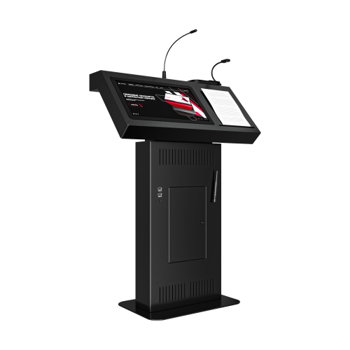 Среди достоинств трибуны - профессиональный микрофон для качественной передачи звука, антивандальный корпус, яркий сенсорный экран, документ-камера для отображения файлов на большом экране, дополнительные внешние разъемы. Модель оснащена местом для размещения документов.