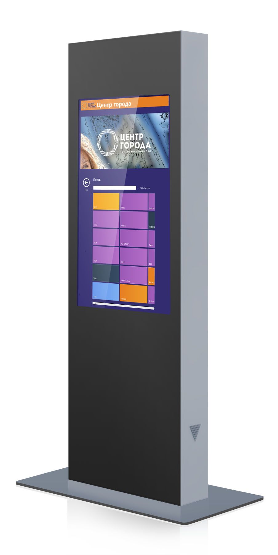 Всепогодный киоск закрепляется на ровной горизонтальной поверхности, служит информационным помощником. Сенсорный экран с емкостной пленкой считывает от 2-х касаний. Пользователь загружает видеоролики и презентации, виртуальные экскурсии, рекламу, визитки учреждения.