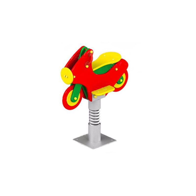 Основание представлено 2-мя плитами (верхней и нижней) и 2-мя цилиндрами, между которыми закрепляется виброустойчивая пружина. Яркий корпус оформлен в виде в виде мотоцикла, украшен фигурными элементами из фанеры. Поверхности детской качалки влагоустойчивы, углы закругляются. Опоры для ног и поручни помогают ребенку подняться на тщательно отшлифованное сиденье.