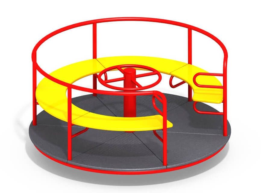 Детская карусель с ограждениями и рулем размещается на территории ДОУ или школы. Уличное оборудование подходит для тренировки вестибулярного аппарата.