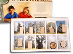 Продольные срезы перечисленных растений, а также поперечные срезы ели и осины демонстрируют структуру, цвет и текстуру древесины. Натуральные материалы сопровождают 8 цветных фотографий (5x7 см) общего вида растений.
