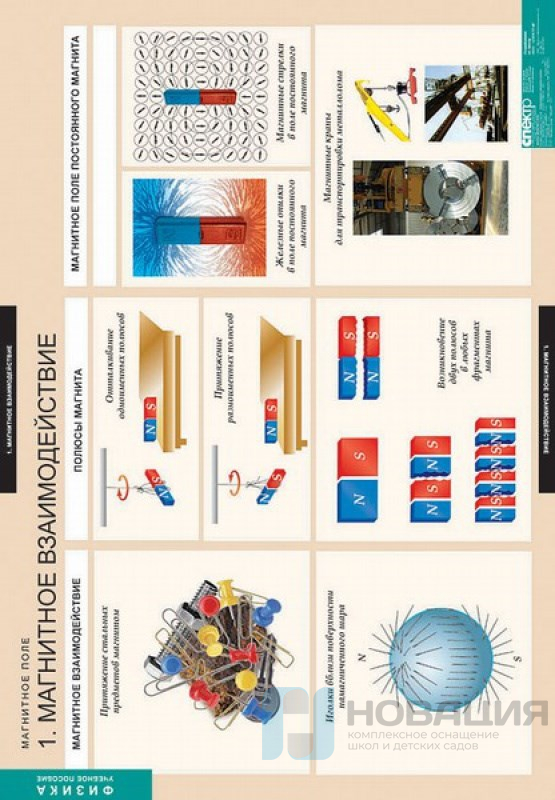 Плакаты для изучения магнитного поля собраны в альбом. Статьи сопровождаются цветными рисунками и формулами.