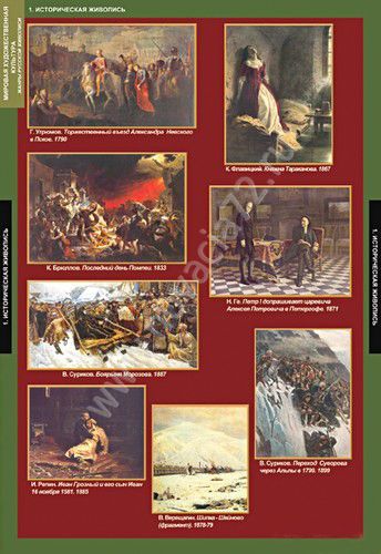 Комплект плакатов из качественной фотопечати на которых изображены историческая живопись, религиозная живопись, мифы, сказки, легенды в живописи, портретная живопись, пейзажная живопись, бытовой жанр, натюрморт, смешение жанров.
