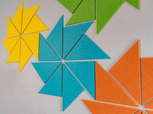 Композиция служит настенной декорацией, защитой от шума, фоном для творческих работ и учебного материала, теплоизоляцией. Цветные панели составляют геометрический рисунок. Возможны разные конфигурации. При необходимости картина перестраивается. Каждый элемент заменяется без повреждения полотна.