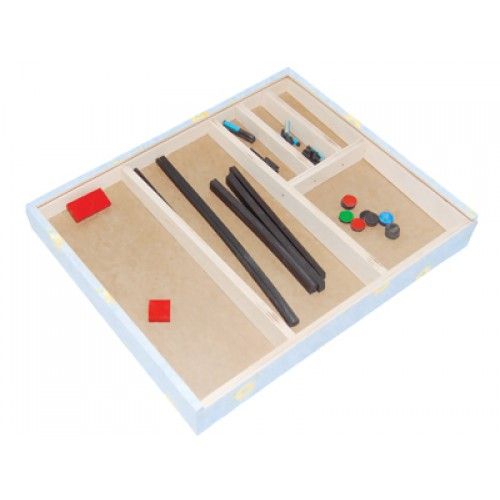 Тифлоприбор состоит из металлического поля с намагниченными полосами из дерева. Гибкие элементы неодинаковых цветов, форм и размеров складываются в планы, рельефные графики.