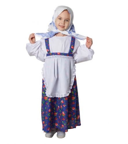 Костюм состоит из сарафана с имитацией блузки и передником и платка на голову. Предназначен для постановок народных сказок, таких, как "Репка", "Курочка ряба" и др.